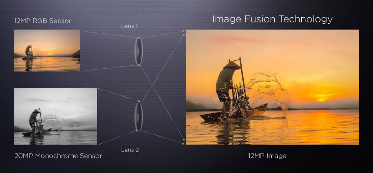 Obrazy z obu tylnych aparatów są łączone w jeden 12 megapikselowy obraz, sensor RGB zapewnia żywe kolory, natomiast monochromatyczny szczegółowe detale.
