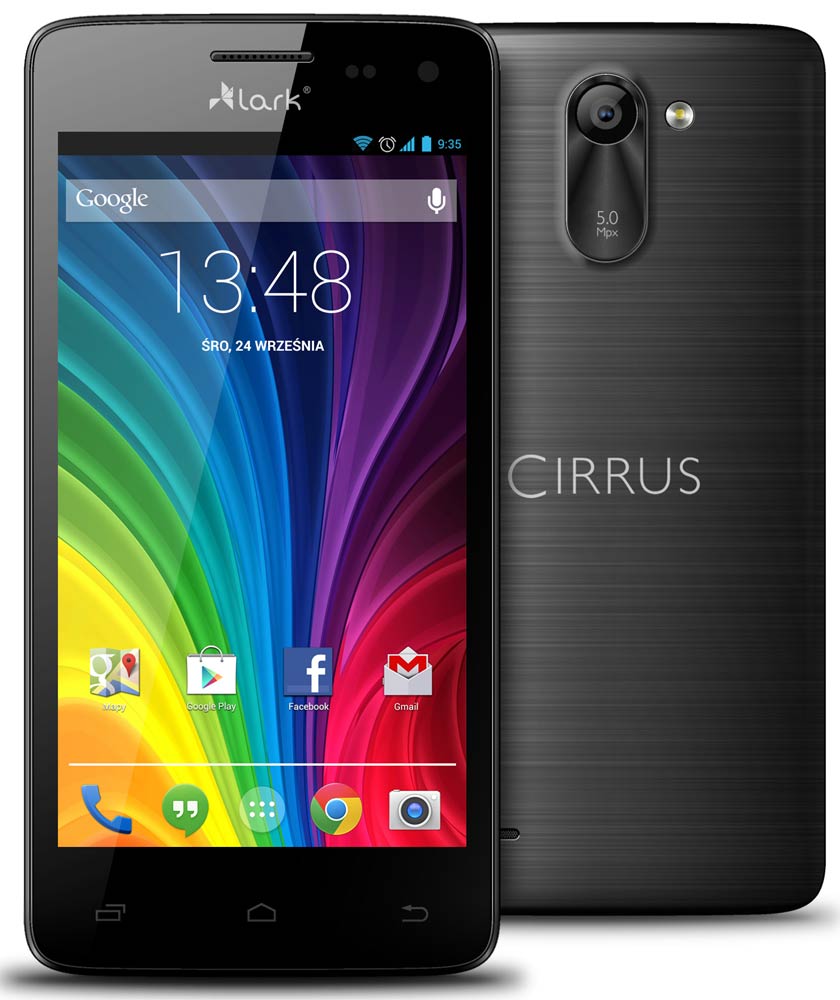 Lark Cirrus 4.5 to smartfon z 4.5 calowym wyświetlaczem o rozdzielczości 480 x 854 pikseli, wyposażony w dwie kamery, z przodu o jakości VGA, z tyłu 5 megapikseli. Akumulator ma pojemność 1600 mAh.