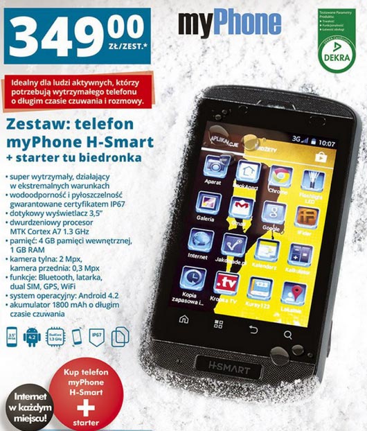H-Smart to jeden z najnowszych smartfonów myPhone, przeznaczony dla użytkowników wymagających od telefonu dużej odporności na uszkodzenia i czynniki atmosferyczne. Telefon jest wodo-pyłoszczelny (ma certyfikat IP67) oraz wstrząsoodporny. Już 3 listopada ten wytrzymały smartfon będzie dostępny w Biedronce w cenie 349 zł.